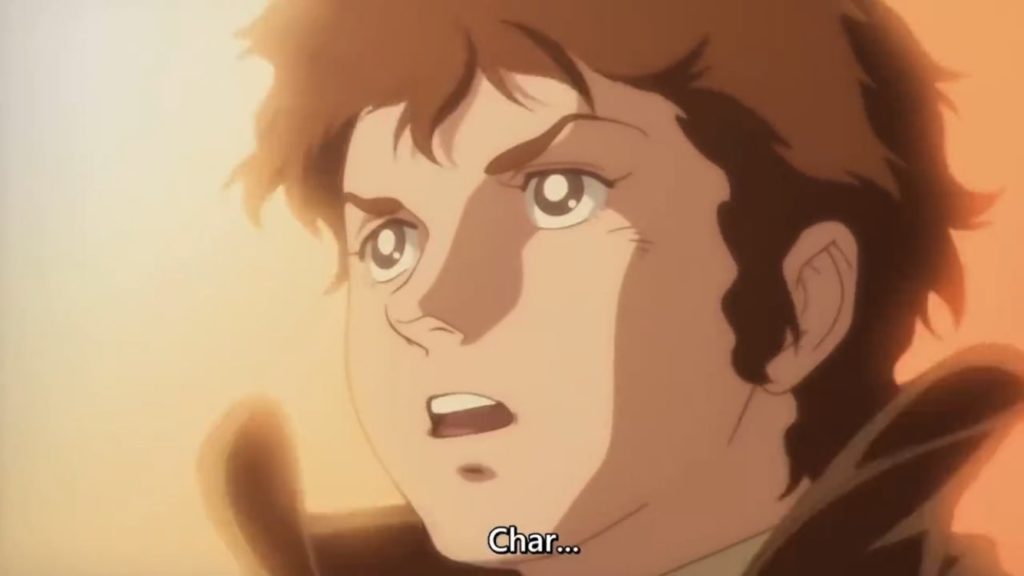 Char and Amuro meet again in the last scene of the first movie, The Heir to the Stars. The two murmur, “I’m sure of it, that’s Amuro Ray” and “I said Char, didn’t I?” as the cockpit of the Hyaku Shiki opens and Amuro’s hair is blowing in the wind… The “wind” in that scene was very impressive.