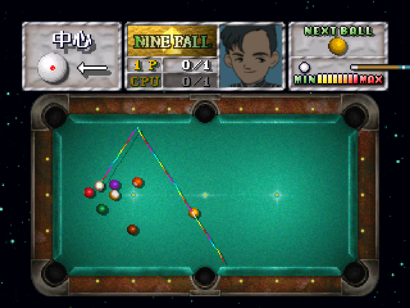 For this game, you play 9 Ball against the CPU, which involves taking turns hitting the numbered balls into the pockets in numerical order. The person who hits the 9 ball in is the winner. You can change the angle, power, and shot type, with the rainbow line acting as a guide.