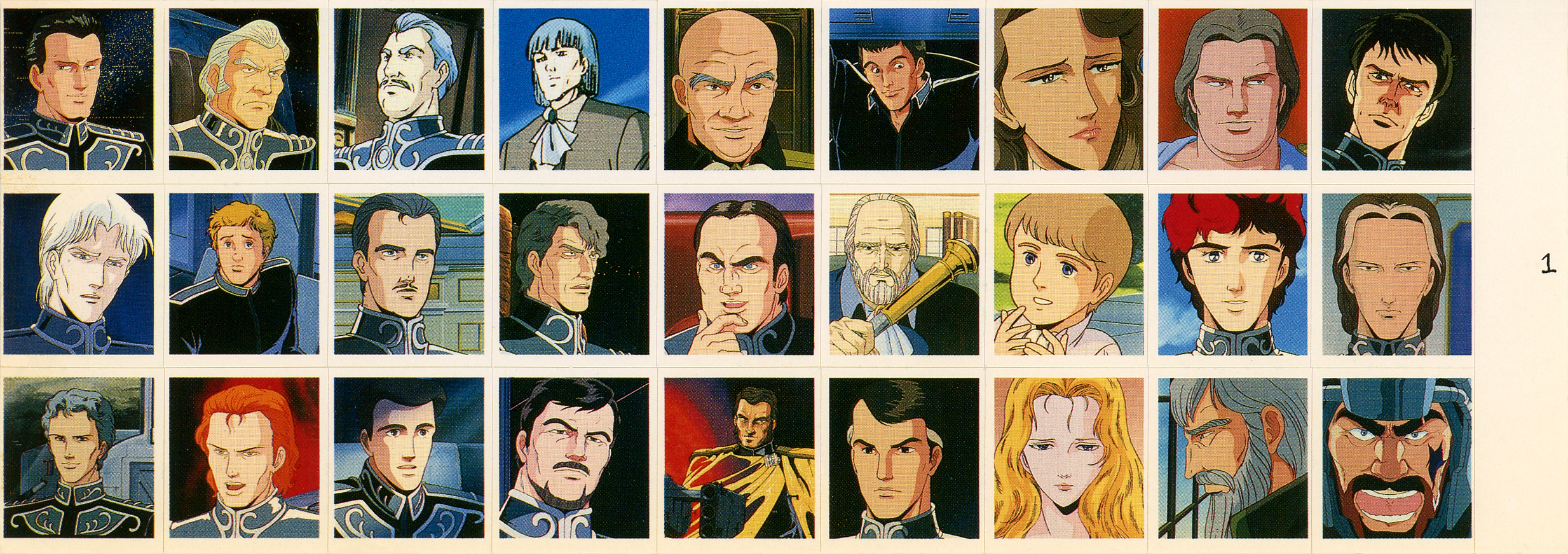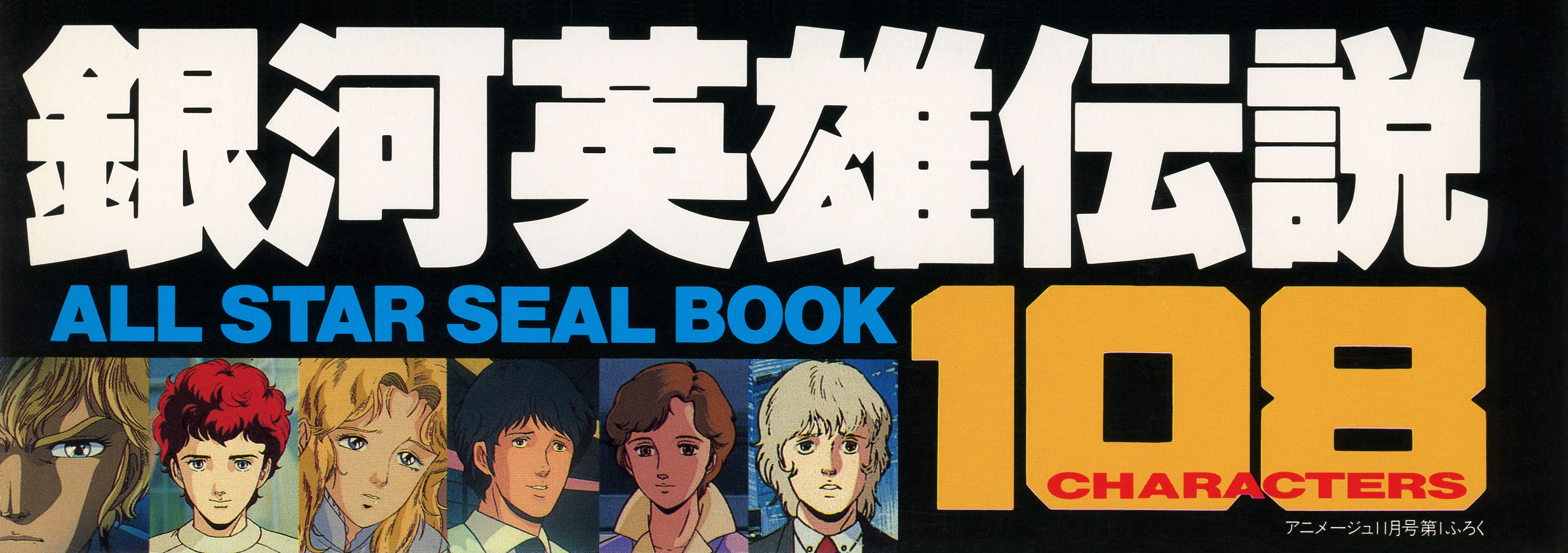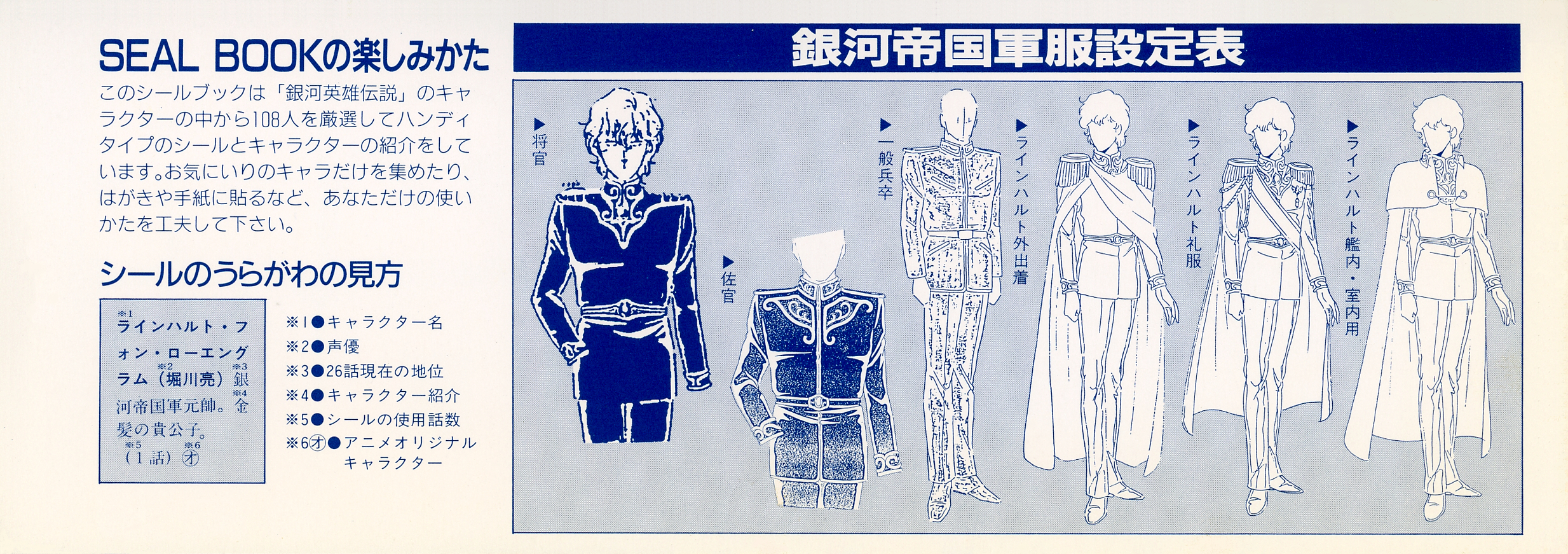 The November 1989 issue of Animage (which I plan to one day cover in more detail on this blog) comes with a bonus Legend of the Galactic Heroes Sticker Book, or SEAL BOOK as it is titled on the book itself. In addition to stickers of characters from the first season of the OVA, it also includes a small blurb about each of them and uniform guides for the Empire and Alliance.