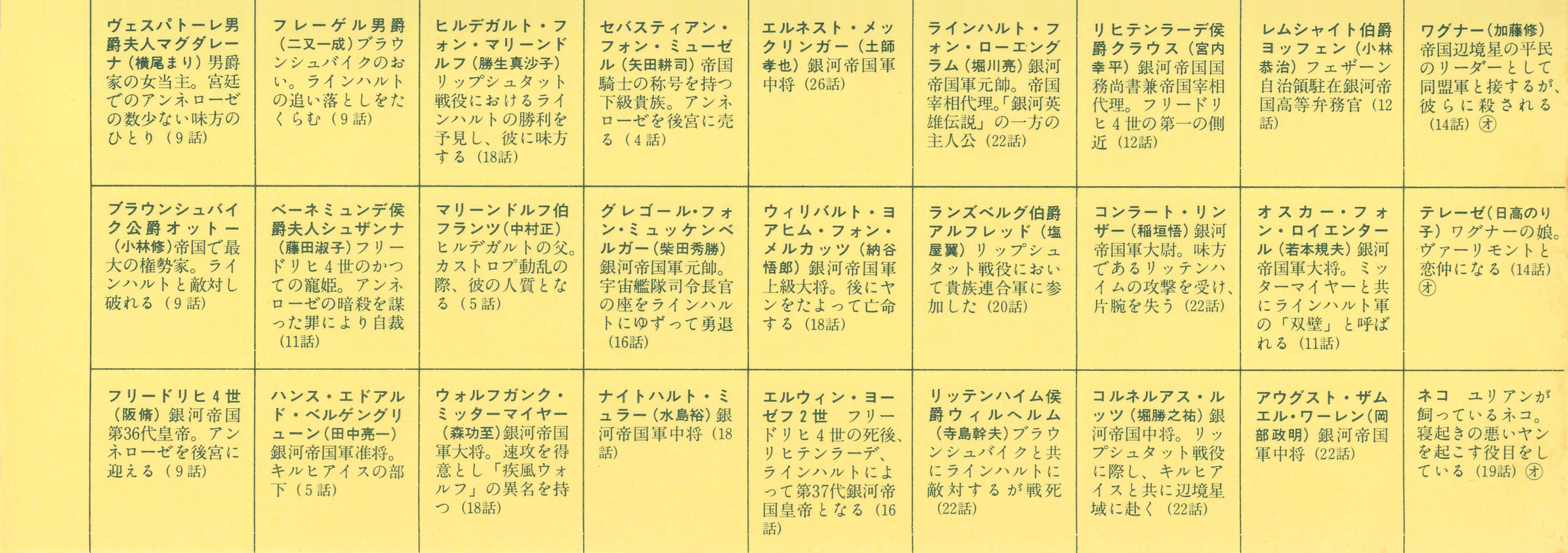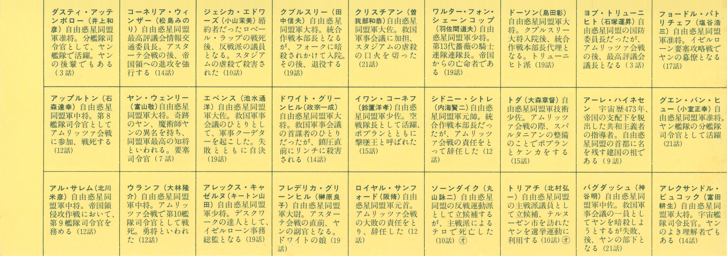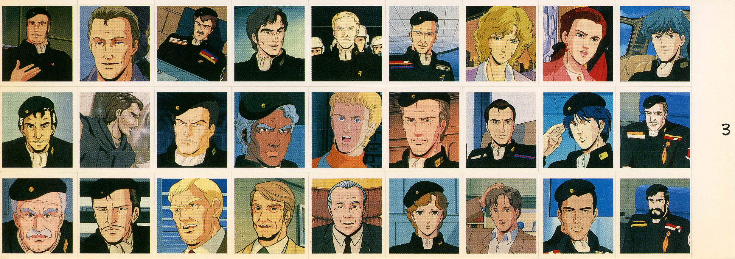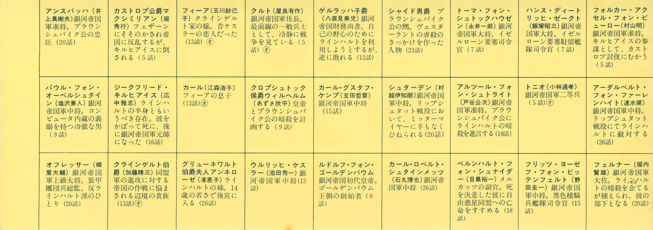 The November 1989 issue of Animage (which I plan to one day cover in more detail on this blog) comes with a bonus Legend of the Galactic Heroes Sticker Book, or SEAL BOOK as it is titled on the book itself. In addition to stickers of characters from the first season of the OVA, it also includes a small blurb about each of them and uniform guides for the Empire and Alliance.